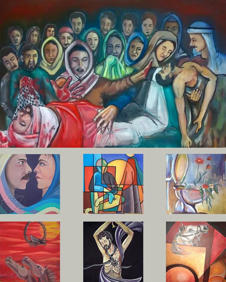 “I’d like to say that painting is my passport to the world. It is my only pleasure in this life. It is no coincidence that some symbols come more frequently. The woman’s frequent presence is an indication of the homeland or the good land. Birds are sometimes an indication of the desire to be liberated and to stay in a circle of inner peace for some time. This is something difficult to achieve in my country – subjected to successive wars. There is no doubt that each symbol has the power to suggest the meaning of Palestinian existence.”
