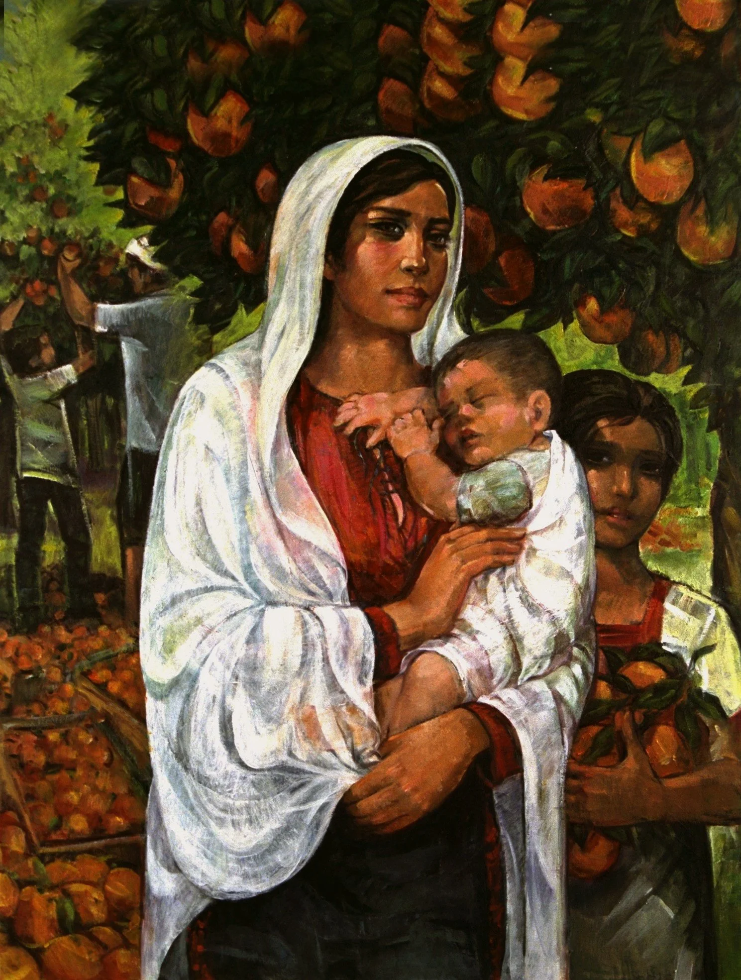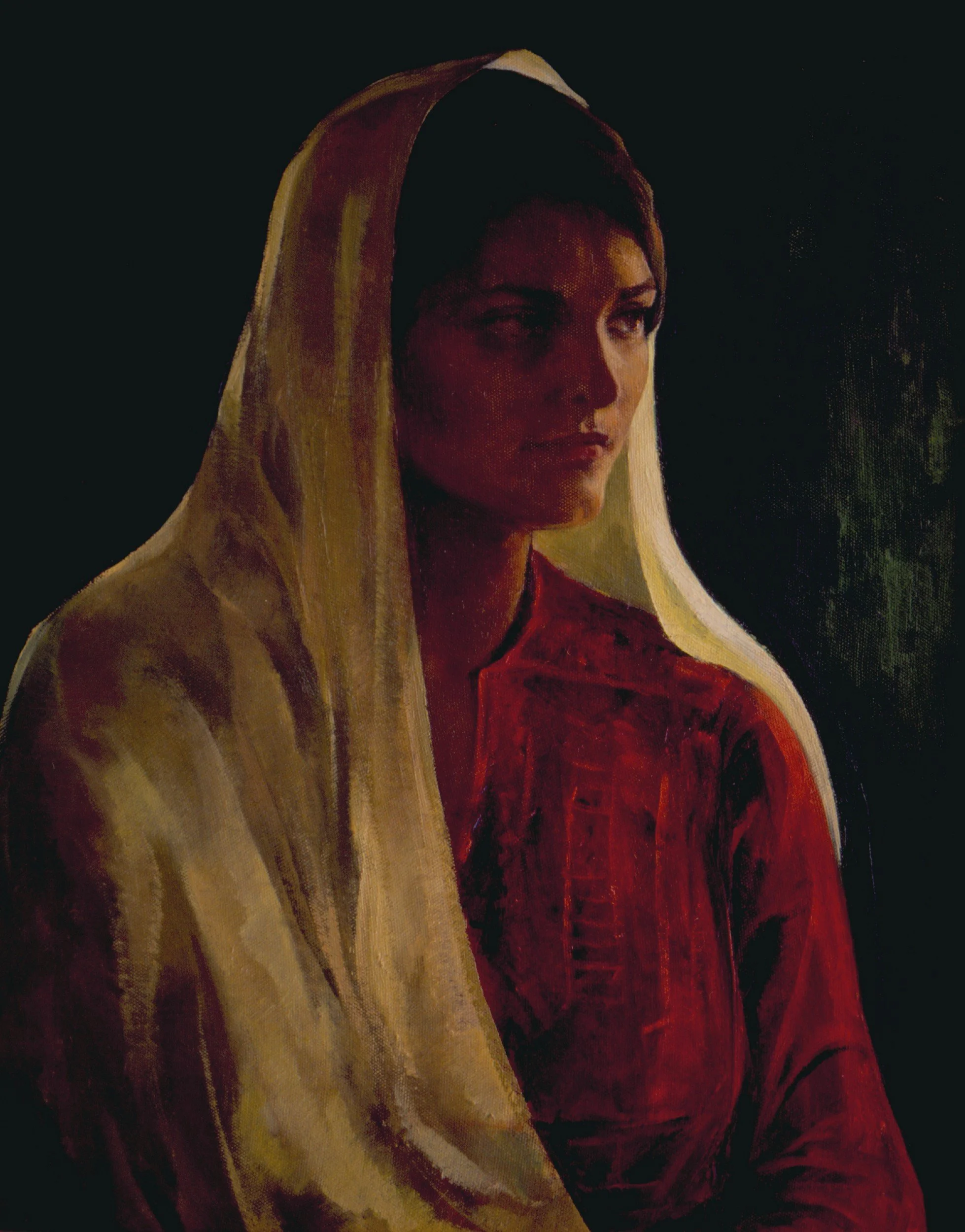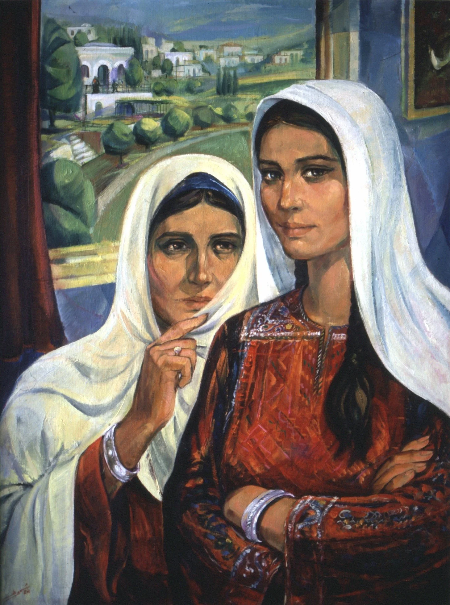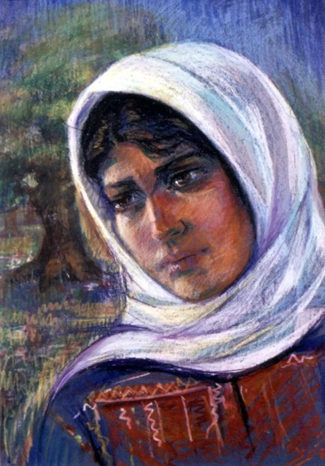 The artist’s wife sitting gracefully with a red Palestinian shawl over her shoulders