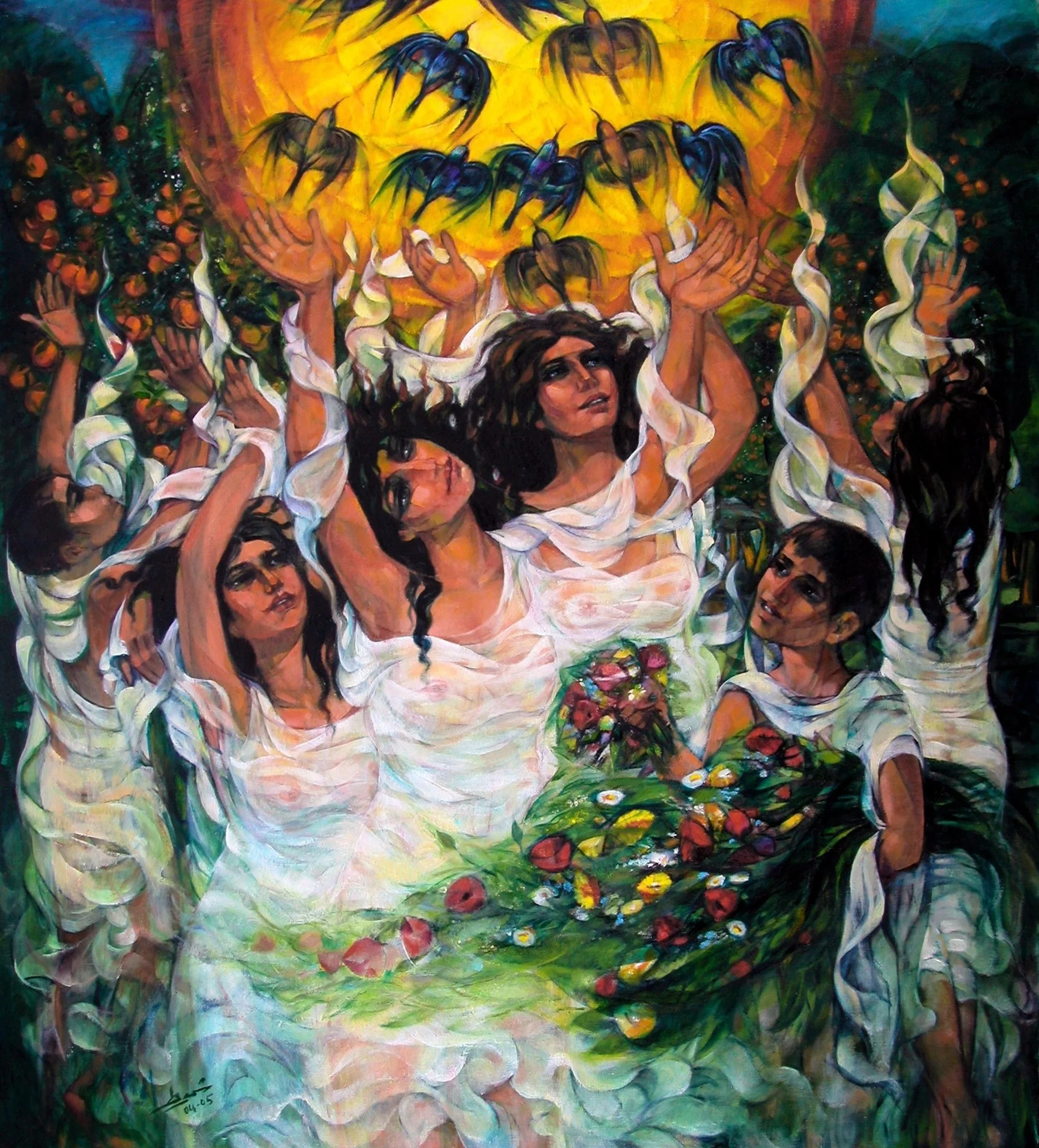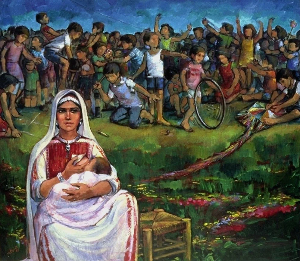 The series concludes with The Dream of Tomorrow (2000), a hopeful image that portrays children flocking to a benevolent Mother Palestine, gathering flowers and fruits for her as birds fly freely overhead.”