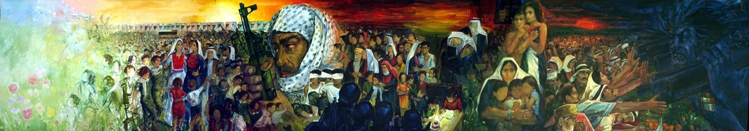 “Scenes from Palestinian history overlap in multidimensional compositional narratives, using visual strategies reminiscent of Mexican Muralism.