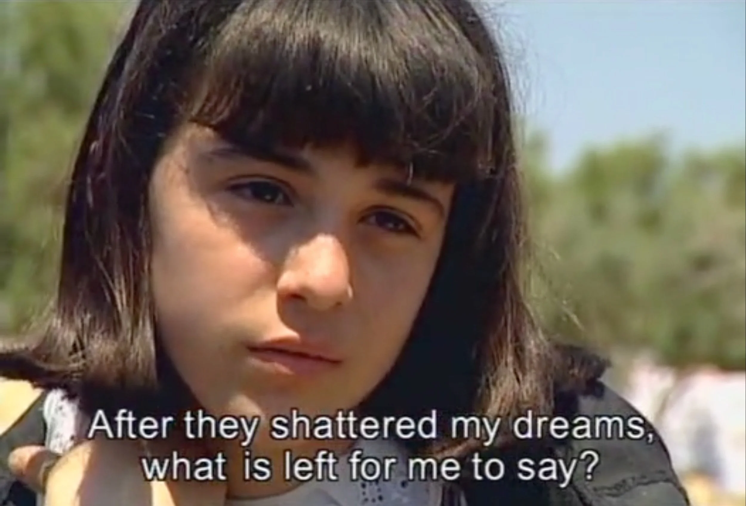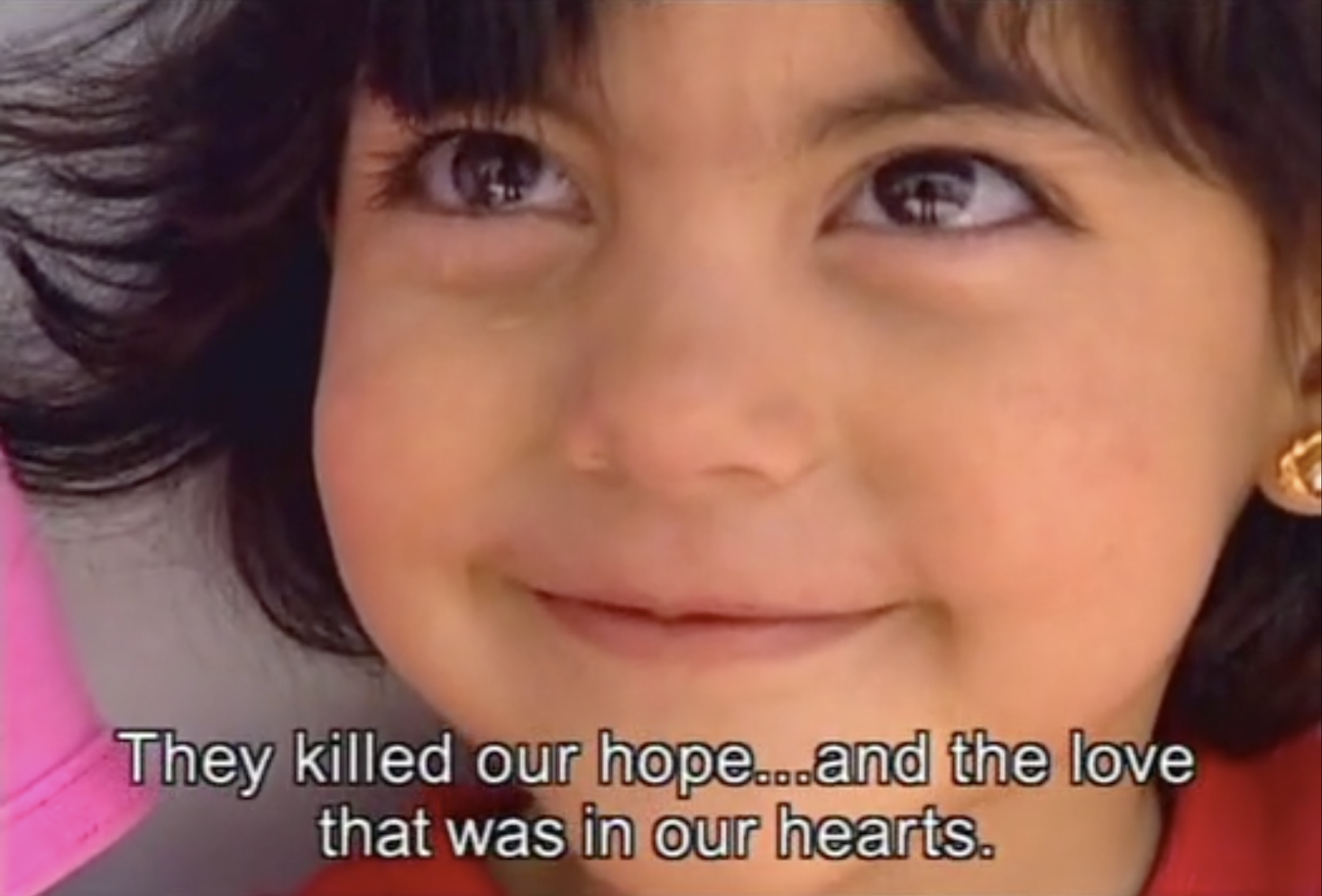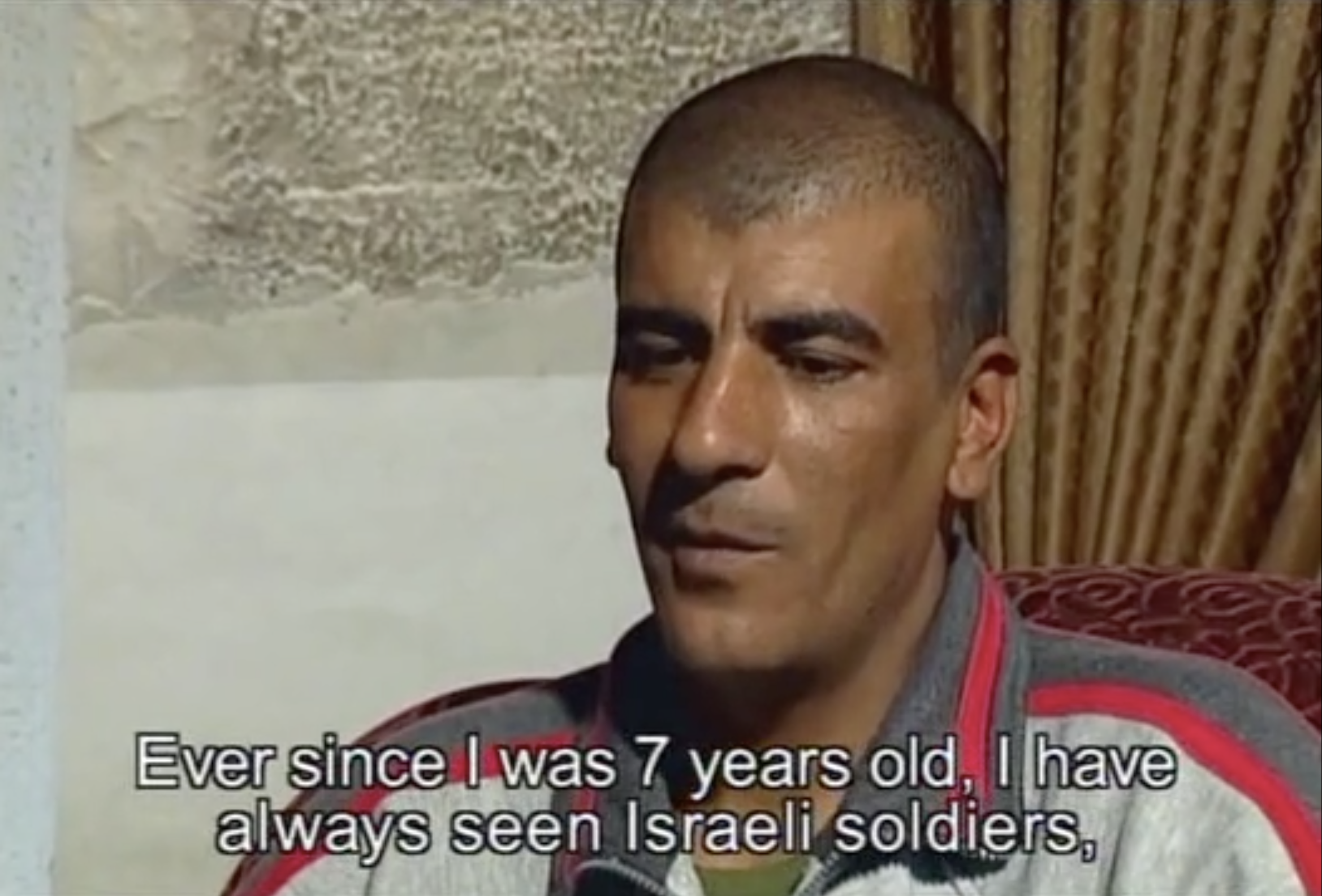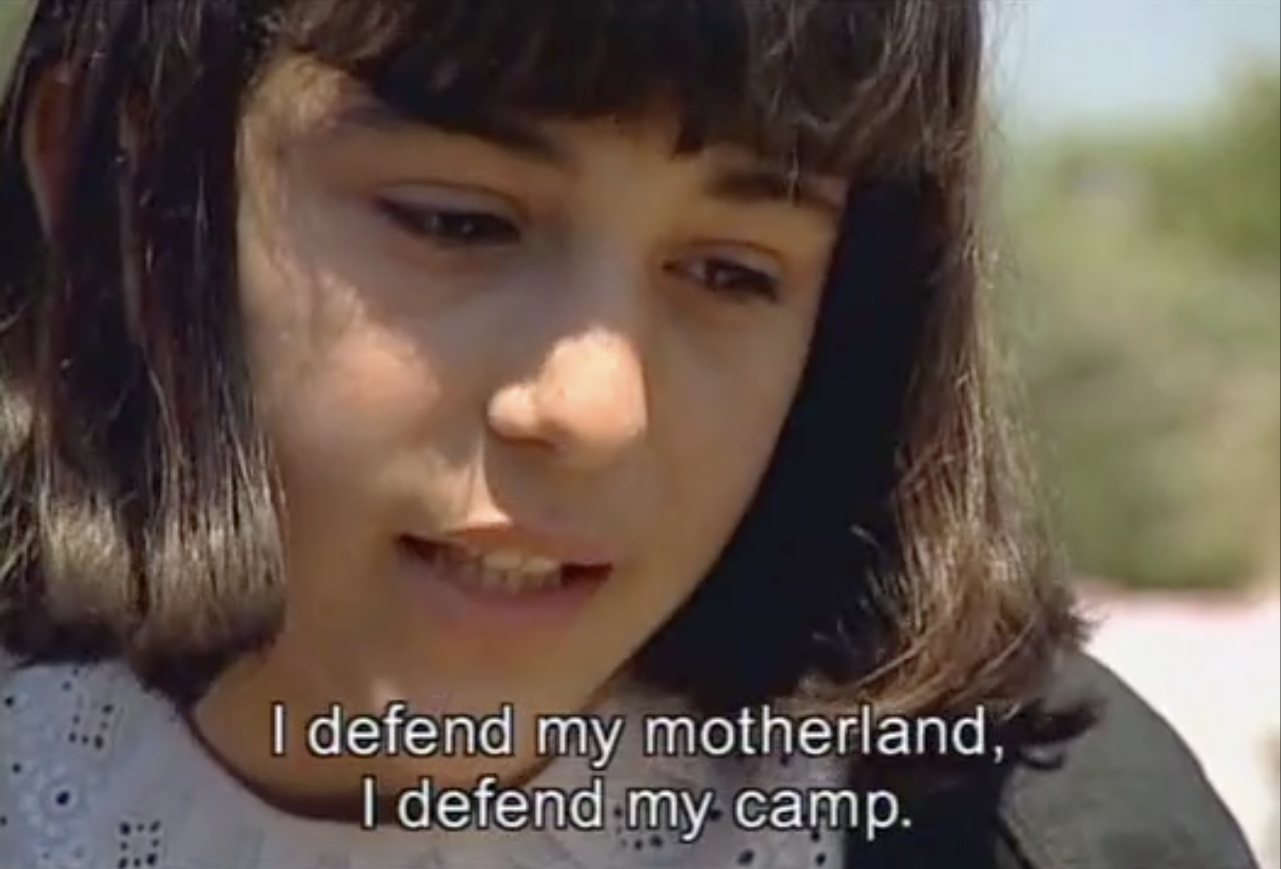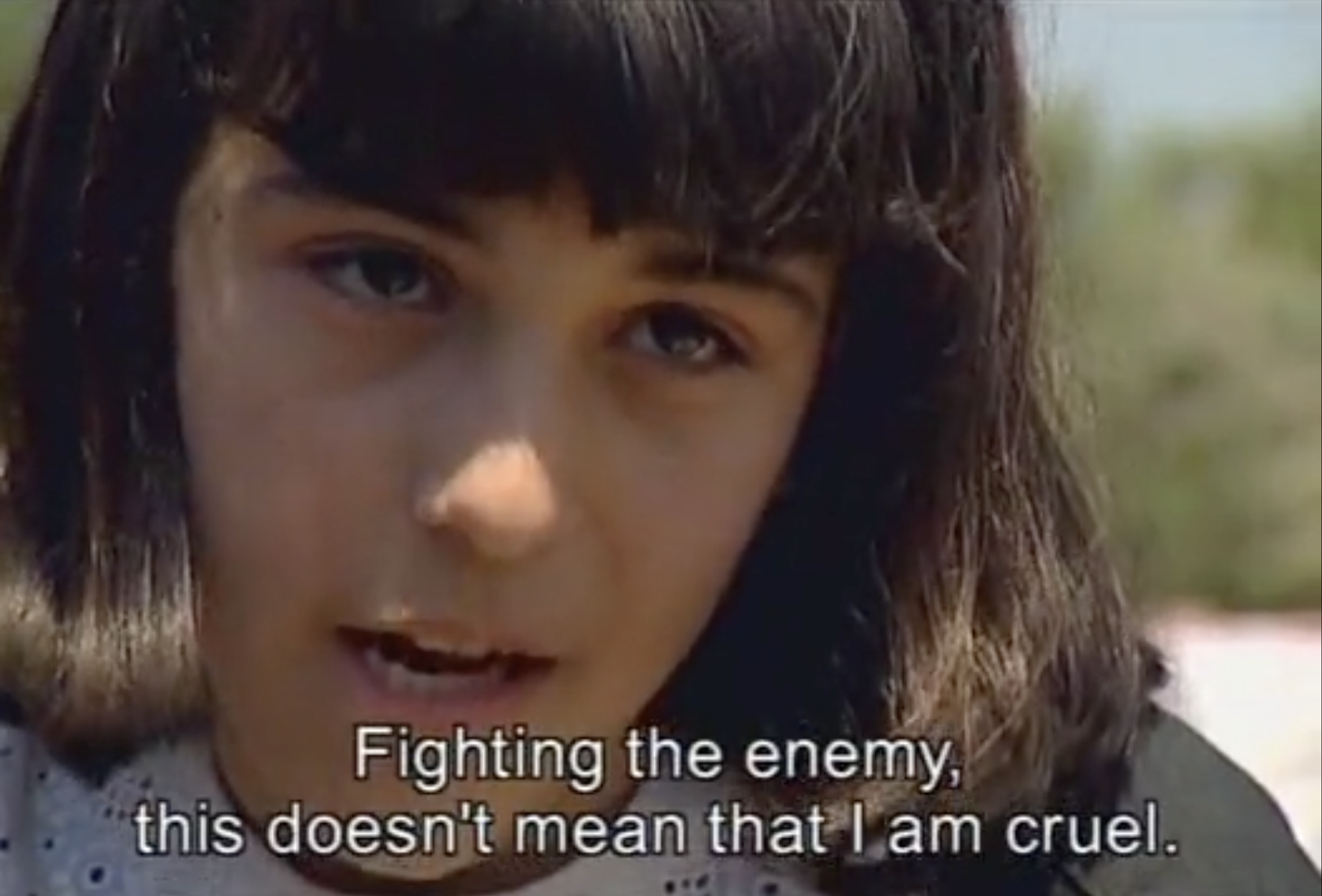 There are also thematic cuts in the editing. One adult man speaks about how Palestinians thought all of this would be traumatizing for their kids, but in fact his son does not even fear the planes anymore and can tell what every different type of attack is. The man says he thinks if you talk to any of these kids, he bets they will respond with the utmost courage. The film then cuts to a young girl of the Jenin refugee camp, who we’ve seen speak already at this point.