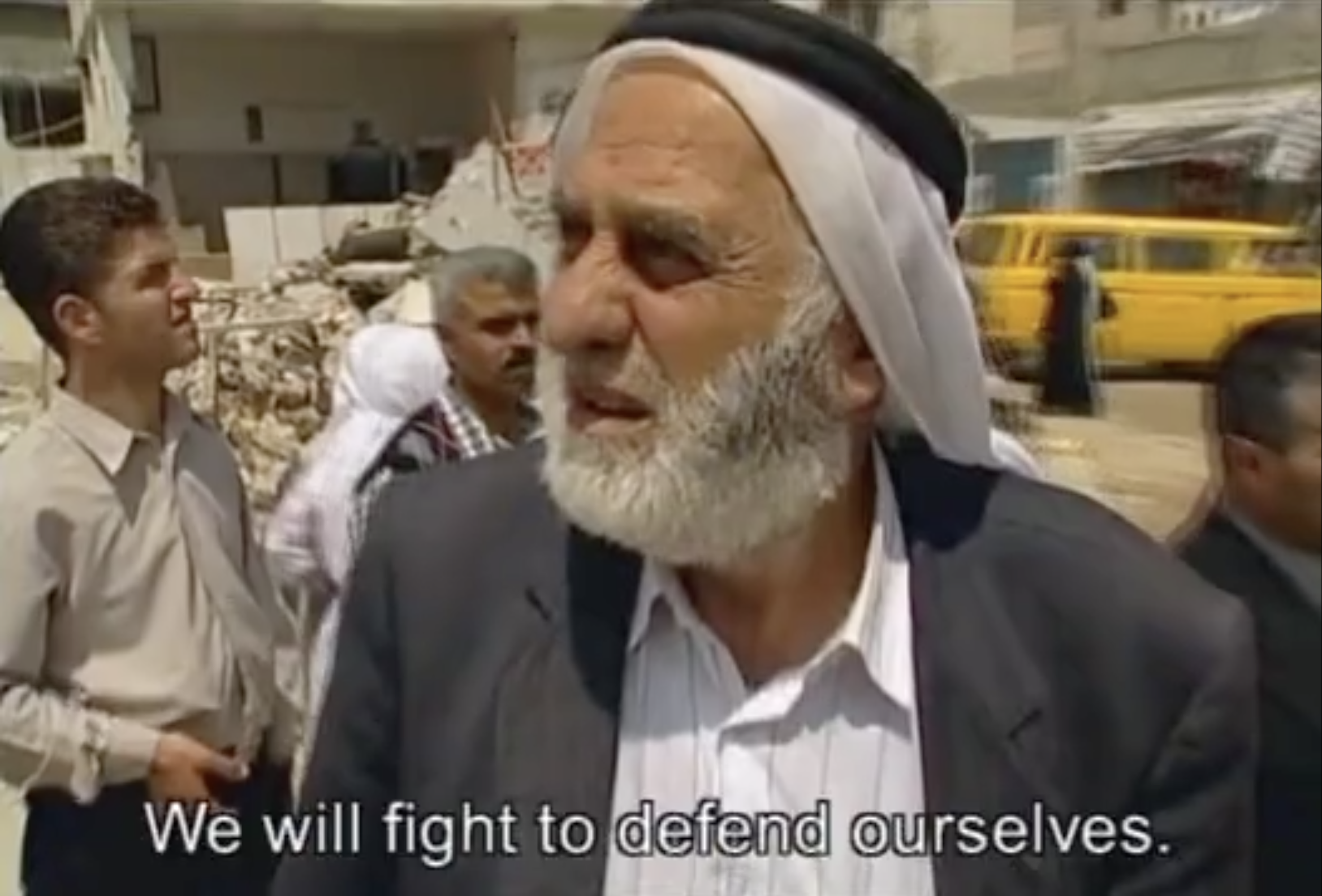 Most people, however, know Bakri for his 2002 documentary – and the main focus of this feature – which is Jenin, Jenin. That film takes place after the Battle of Jenin between the Israeli army and Palestinian resistance in April 2022. It primarily features residents of the refugee camp speaking about their experience with what had just happened.