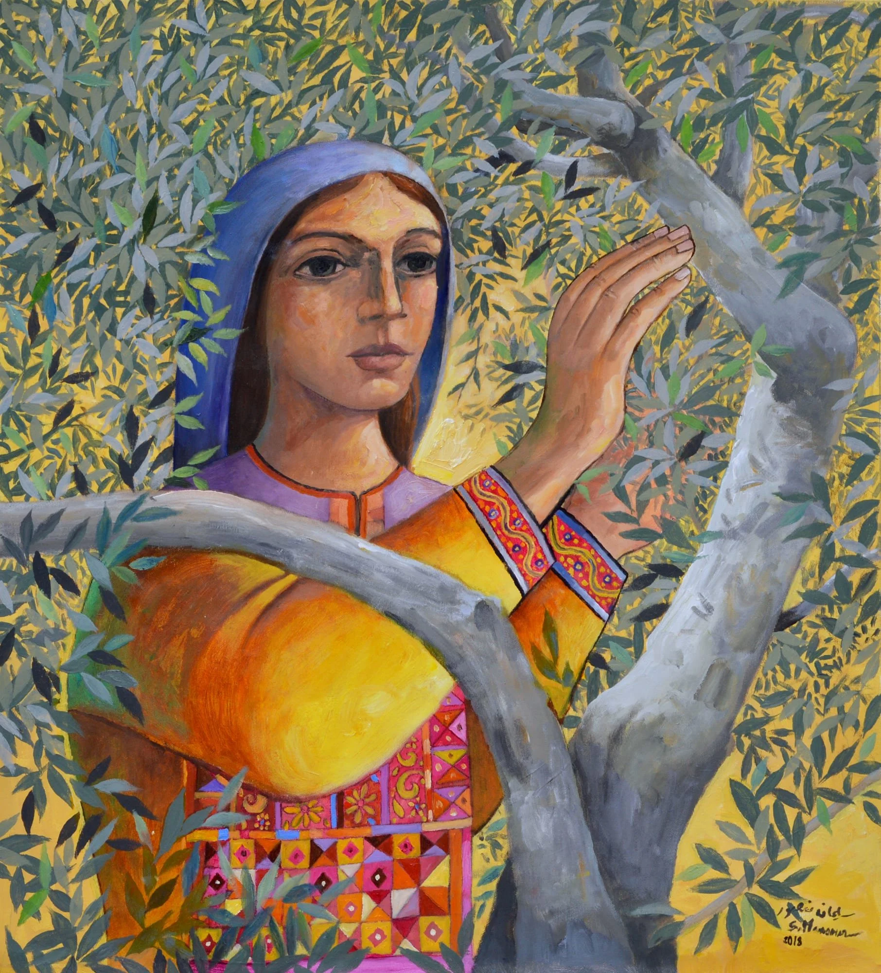 His work emphasizes Palestinian culture, history, and traditions – especially to the land and native trees such as olive trees or orange trees. You can also see it in his paintings of Palestinian villages or of women in traditional embroidered dresses.