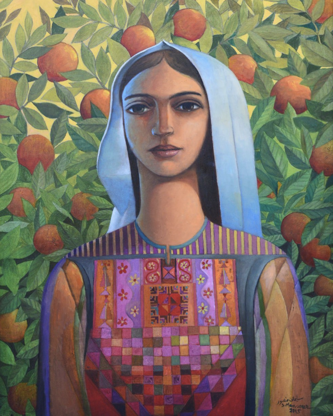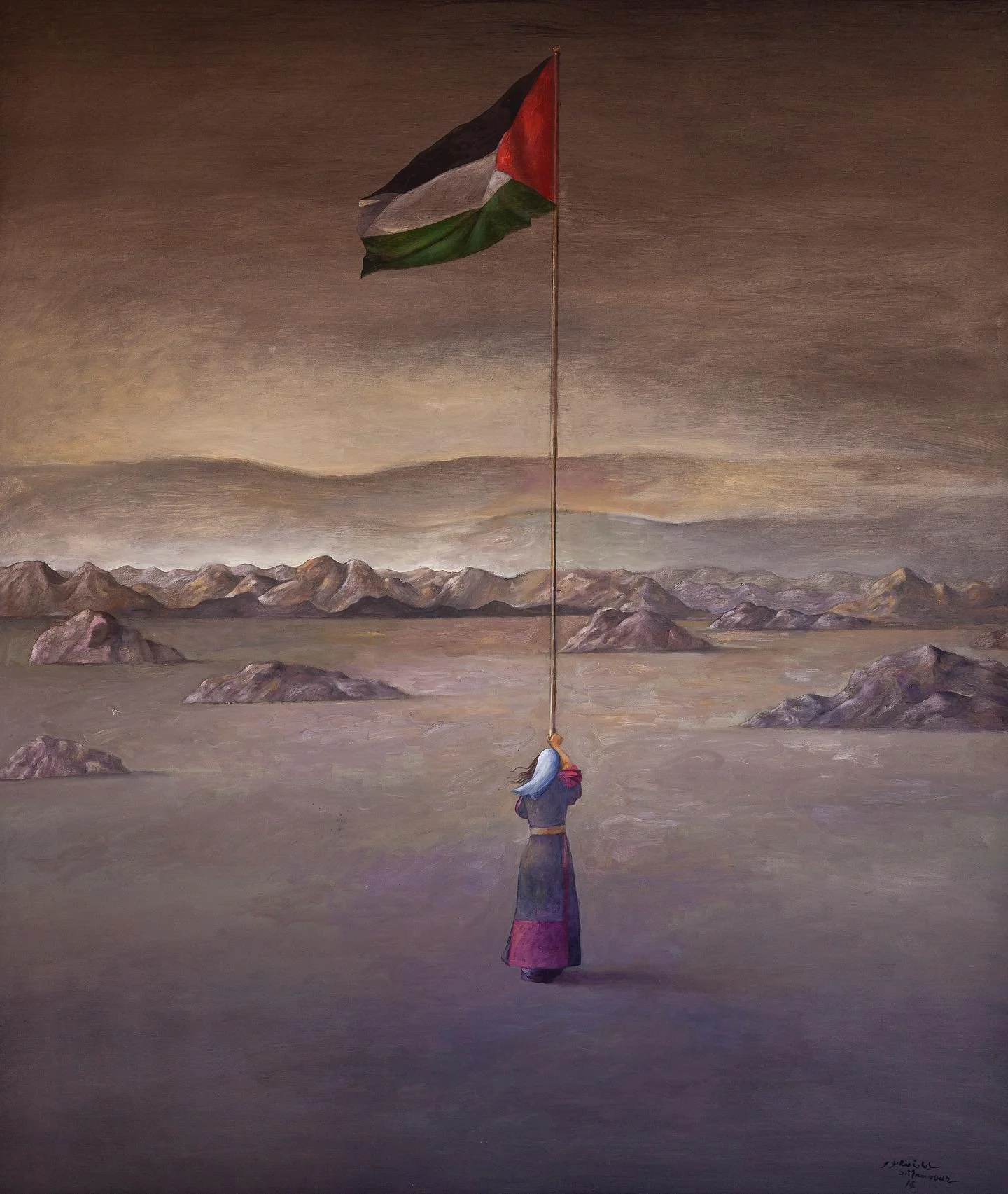 In 1976, Mansour created the Bride of the Homeland painting of schoolgirl, Lina Al Nabulsi, who had been martyred. On her way home from school in uniform, she had joined a protest in support (which was common for students to do). Israeli Occupation Forces decided to chase Al Nabulsi and her friends into a building, where she hid under a table. The IOF then martyred her in cold blood.